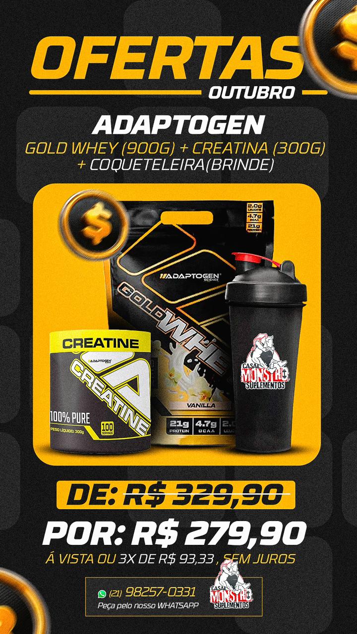 O God Whey Adaptogen contém 900g de suplemento em pó , com fórmula que favorece rápida dissolução e digestão, enquanto a Creatina Adaptogen vem em pote com 300g para uso contínuo. A coqueteleira plástica acompanha o combo, garantindo praticidade e mobilidade para o consumo diário.