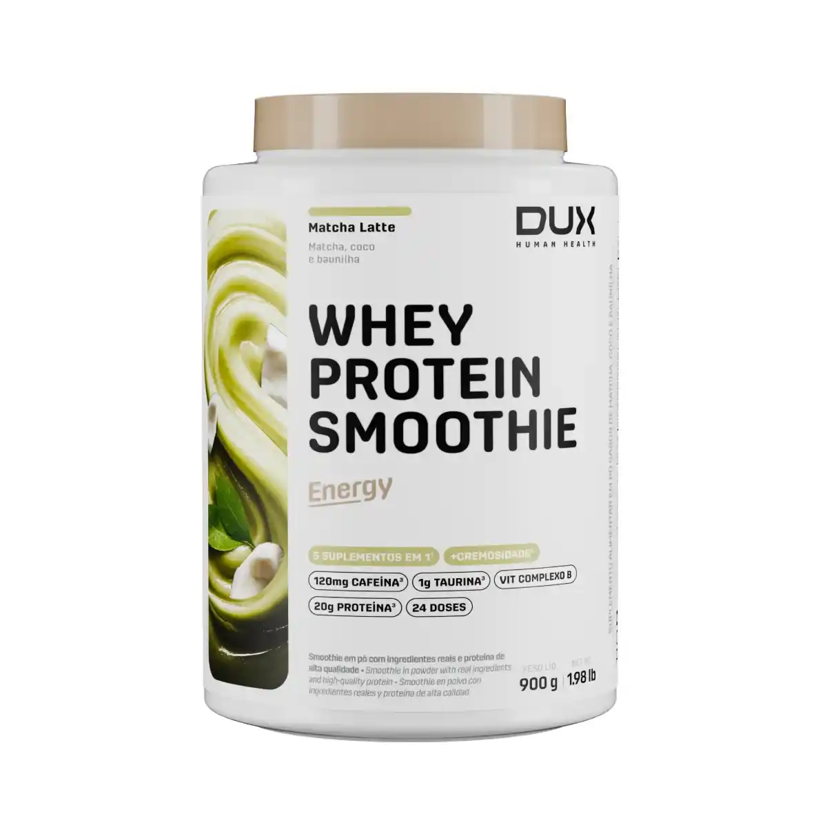 O Whey Protein Smoothie Energy DUX sabor Matcha Latte é um suplemento proteico "5 em 1" que mistura Matcha, coco e baunilha, focado em energia, foco e recuperação muscular. Cada porção contém 20g de proteína, 120mg de cafeína, taurina e vitaminas do complexo B, oferecendo uma textura cremosa e sem adição de açúcar em pote de 900g.